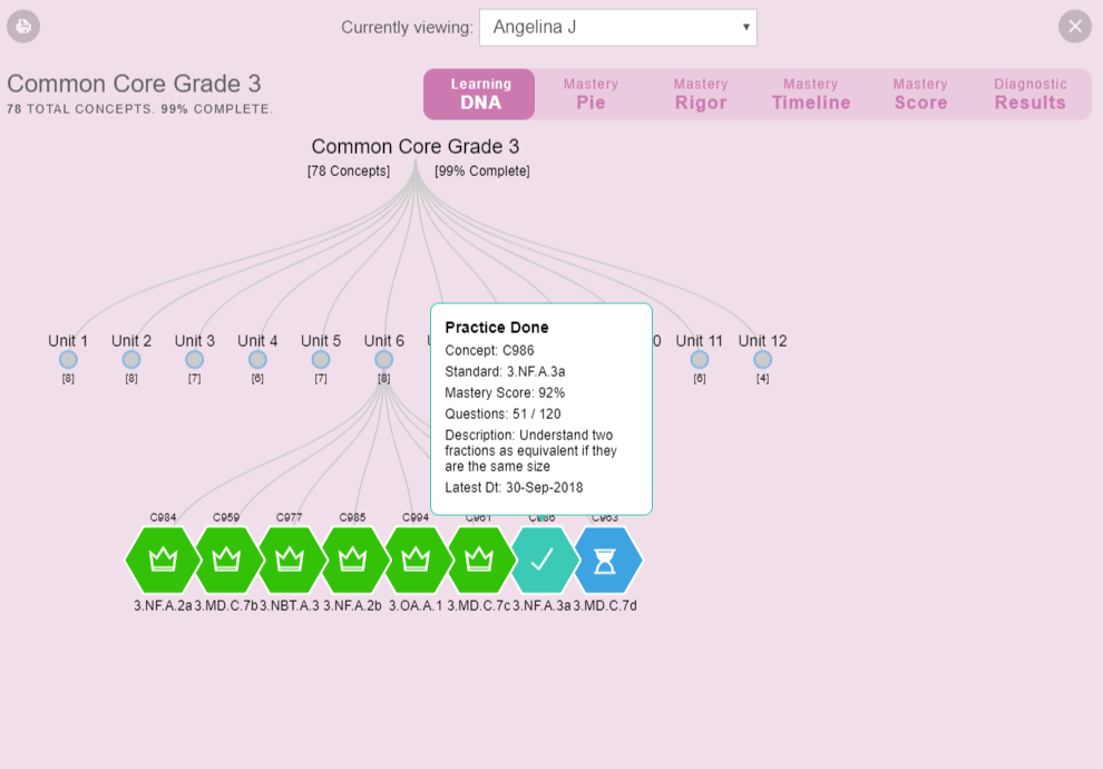 The Student Learning DNA reflecting a deeper student profile enables the platform to tailor a unique learning experience and mastery journey for each student.