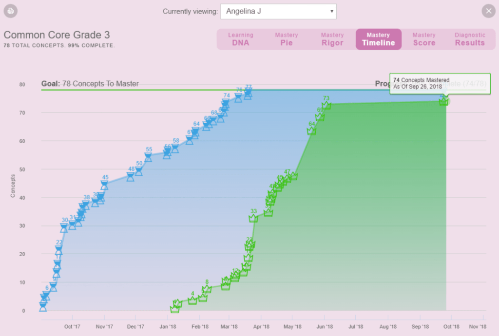 ScootPad’s mastery-based learning is sensitive and conducive to learning continuum to guide learning over time so that student competence in the domain can be advanced coherently and continuously. For instance, if a student has already mastered a grade level curriculum on ScootPad and moves to the next grade level curriculum, they start off “warm” with their learning path (as opposed to starting “cold” with no data). The Adaptive Engine takes into account the entire Student Learning DNA which reflects the student’s previously mastered concepts and their unique trajectory through the learning path and uses this intelligence to maximize student learning continuously from that point forward.